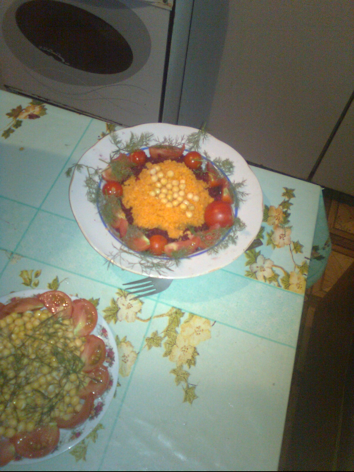 Чтобы приготовить такой салат необходимо:морковь, помидоры, пророщенный горох, бурак, зелень. Натереть морковь и бурак. Нарезать помидоры. И выложить на тарелку