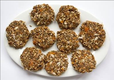 Тесто: молотый орех, кунжутный жмых, мука льна и мед. Все это перемешать.